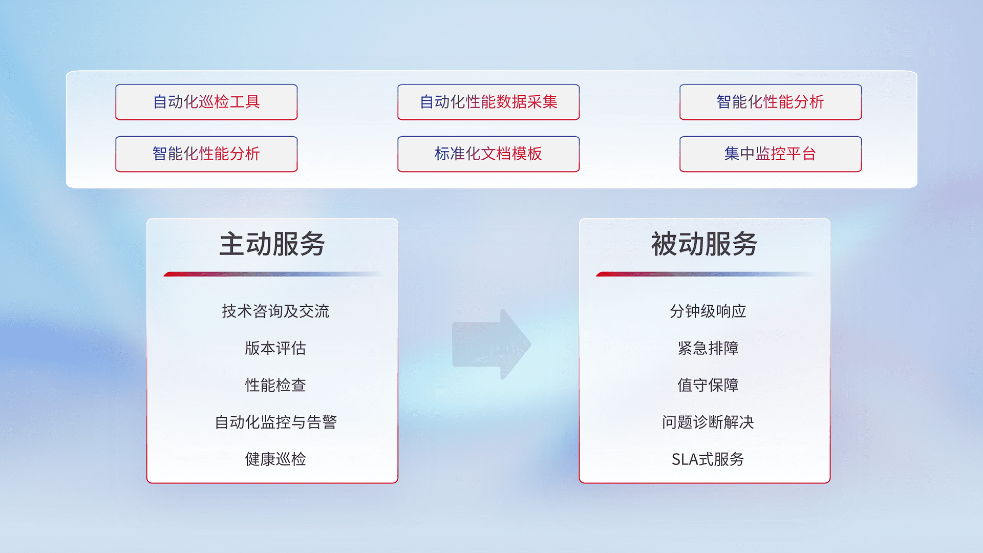 智能化工具和标准化文档,,,,保障服务质量,,,,提供主动服务(包含技术咨询、、、版本评估、、、、性能检查、、自动化监控与告警、、健康巡检)和被动服务包含(分钟级响应、、、紧急排障、、值守保障、、问题诊断解决、、SLA服务)。。